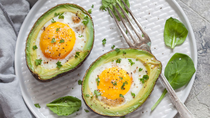 Закуска: Печени яйца в авокадови кошнички (използват се корите на авокадото);
